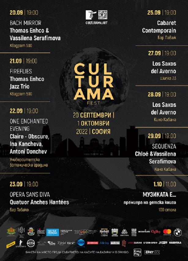 The daring and innovative quartet Anches Hantées, the unexpected transcriptions and stunning arrangements of Clair-obscur, the phenomenal Cabaret Contemporain and their electronic music with acoustic instruments, the stratospheric sax quartet Los Saxos Del Averno, the French electronic music composer and DJ Chloé and the extraordinary pianist , born in France – Thomas Enhco, are just some of the names of the international artists with whom the CULTURAMA festival will meet us. The Bulgarian presence at the festival in an interesting artistic collaboration with international musicians is due to the operatic soprano Ina Kancheva, the Bulgarian percussionist and composer Vasilena Serafimova and the bright contemporary musician who easily and skilfully handles the wide variety of forms in his performing and composing activities – Antoni Donchev.
