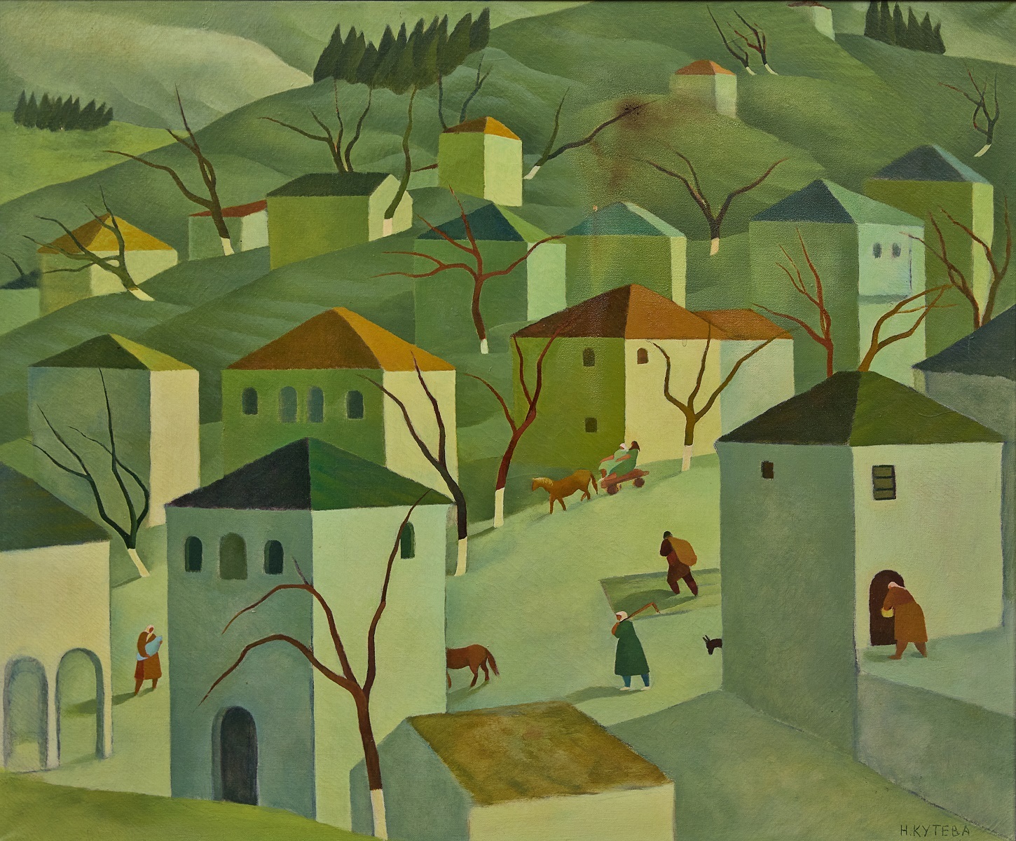Nadezhda Kuteva was born into the family of Philip Kutev - composer, conductor and folklorist and Maria Kuteva - music teacher. She graduated from the National Academy of Arts in 1971 with a degree in "Mural Painting", after which she turned to easel painting. She participated in numerous national and international exhibitions, and has presented her work independently over 20 times. She is the winner of a number of awards, including "Zlatyu Boyadzhiev" (1986), "Vladimir Dimitrov - The Master" (1990), "Zahari Zograf" (2022).