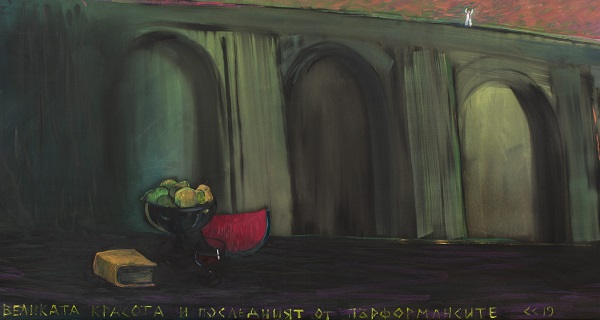 What is obvious is his experience in conceptual strategies, story-telling, narrative, and the paradoxical semantic configurations he creates. Furthermore, he relies on traditional oil painting most often created with velatura layers until expressive pastiness in certain areas is achieved. Stefanov leads the story and constructs the material surface of the painting as one whole, which is why he skillfully avoids turning these works into illustrations of one kind or another. Here, the text develops the image, in a paradoxical way though, getting the viewer to make unusual, curious and progressively unique associations. The exhibition is predominated by pronouncedly horizontal formats. They too can be conditionally referred to as cinematоgraphic, due to their ability to create some kind of story or narrative. This is one of Svilen Stefanov’s trademarks of the last ten years. In these paintings processions and processions of ‘romantics’ are burying ‘conceptualists’, albeit with the utmost respect and reverence. The messages in this exhibition are in most cases devoid of self-comprehensiveness, but they seem to really correspond to the current models in our society and culture. Who are the ‘romantics’ and who are the ‘conceptualists’? Are there any conceptualists at all in the true rationalising sense of the classical movement, or have we always been observing, in most cases, non-conventionalising metaphysicians? Even more unusual is the emergence of the “historical painting" genre which seems to have vanished today, but here we see canvases such as "Ferdinand's Secret Weapons" and "The Last Photo of the Futuristic Army" sending us deep into thought, evoking memories of the years during the First World War. The odd thing is that the works from this last period of Svilen Stefanov are as emotionally charged as rationalising in the metaphysical line of some kind of "Post new objectivity”. Suicides coexist with aliens, beauty is permeated by tragedy, and the heroic is crushed by the idiotic. This is not exactly surrealism, rather it casts a light upon, and divulges, the tension of the emphatically rich and captivating pictorial language, which in turn sublimely reveals the absurdism in the mental fields of modern man. Also present in these paintings are multitudes of hidden meanings regarding art history, philosophy, literature and music, and accordingly, every viewer will see something novel; but even the little is much here. Therefore, this exhibition should not be "interpreted" within the traditional understanding of painted art. A painting literally screams that it is a singular pictоrial surface; yet, what hides beneath the surface of these exhibited works? Isn’t Svilen Stefanov a mystifier, simultaneously embodying a conceptualist and a romantic?