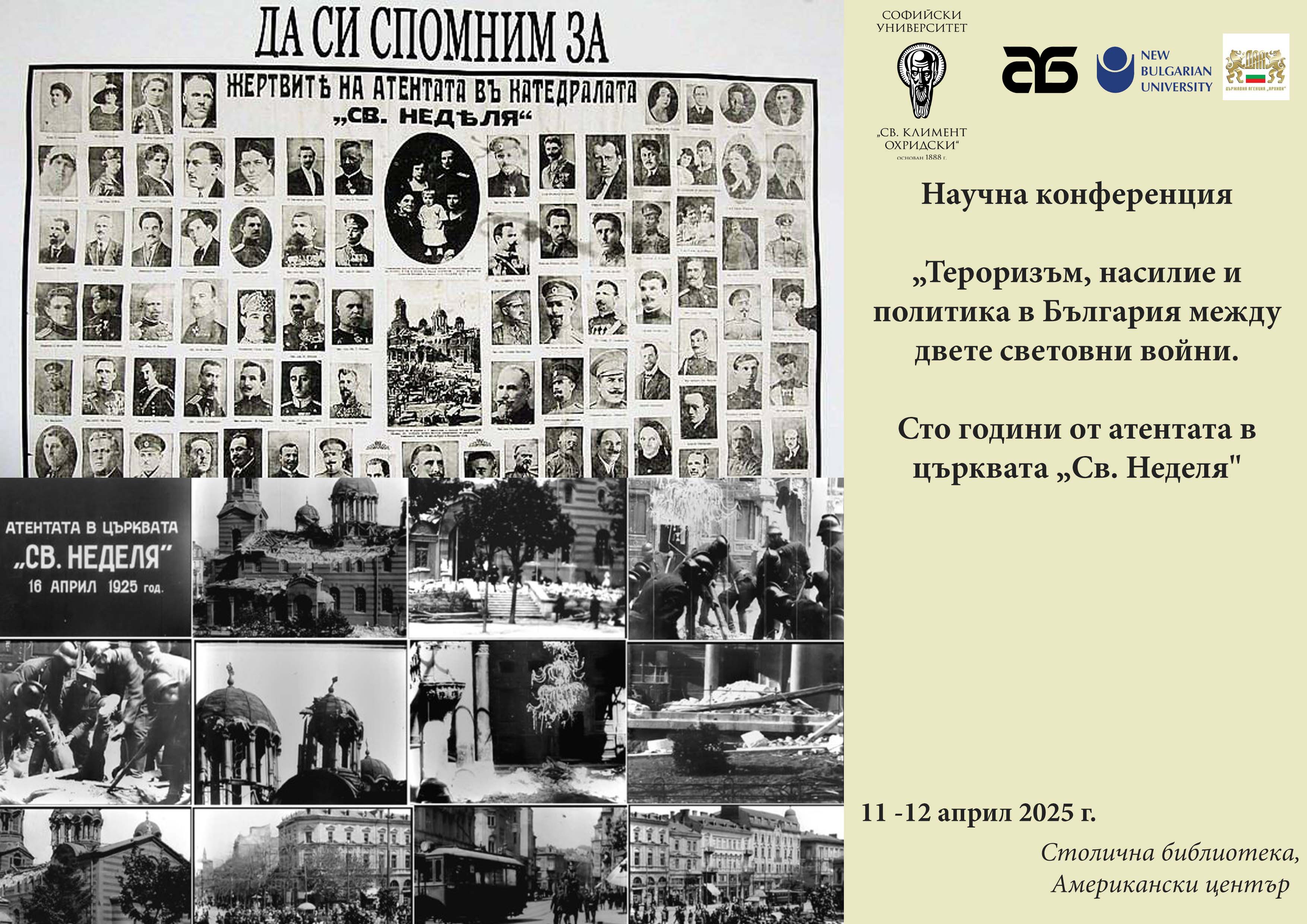 Откриването на конференцията „Тероризъм, насилие и политика в България между двете световни войни. Сто години от атентата в църквата „Св. Неделя“ е на 11 април от 14 ч., а на 12 април ще продължи от 10 ч. В научния форум ще вземат участие видни български историци, учени, изследователи, политолози, общественици. Сред тях са: проф. д.н. Веселин Янчев, проф. д-р Мира Маркова, доц. д-р Михаил Груев, проф. д.н. Момчил Методиев, проф. д.н. Вили Лилков, проф. д.н. Мартин Иванов, проф. д-р Даниел Вачков, Антон Тодоров, доц. д-р Владимир Станев, доц. д-р Светослав Живков и др.