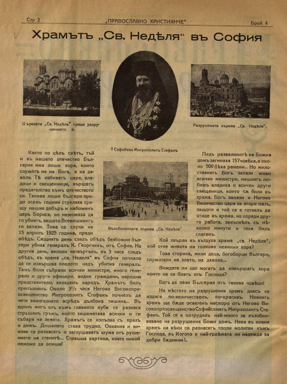 На 16 април 1925 г. Българската комунистическа партия организира един от най-жестоките терористични актове в световната история през XX век – атентатът в църквата „Св. Неделя“. Експлозията събаря главния купол на църквата, затрупвайки вътре множество хора. В атентата загиват 134 души, други умират по-късно от раните си. Ранените са около 500. Загиват кметът на София адвокат Паскал Паскалев, 12 генерали, 15 полковници, 7 подполковници, 3 депутати и множество граждани, включително деца. Кървавата експлозия е дело на престъпни авантюристи, членове на Военната организация на БКП, контролирани от съветските болшевики. Атентаторите целят да се унищожи независимата българска държава като се свали по насилствен път политическото ръководство на страната и се предизвика революция, за да се установи комунистически режим.
