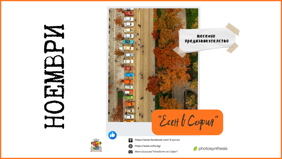 “Есента е втора пролет, защото тогава всяко листо е цвете”. Думите са на Албер Камю, но със сигурност София може да предложи много повече материал за снимки от есенните листа. Фотоконкурсът „В крачка“ посреща ноември с  предизвикателството „Есен в София“. Мрачна или слънчева, с ботуши или по тениска, меланхолична или весела – как виждаш столицата?
