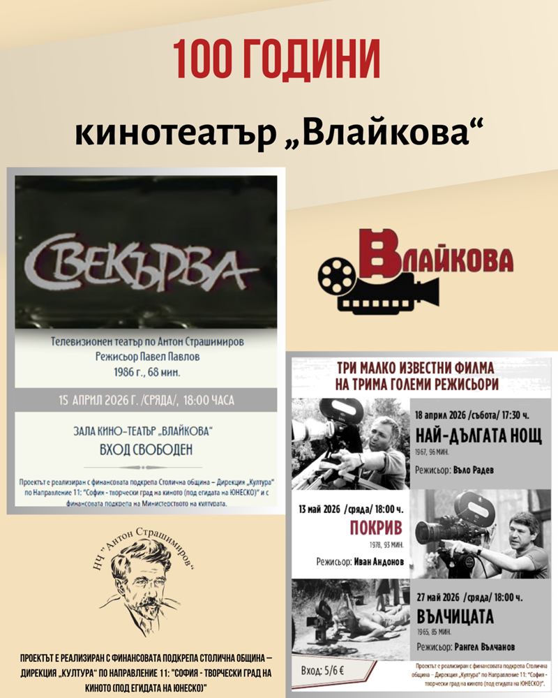 Кинотеатър "Влайкова" и Образцово народно читалище "Антон Страшимиров – 1926" отбелязва своя 100-годишен юбилей със специален проект – Програма от прожекции, представящи знакови и по-малко познати произведения от българското кино, съпроводени от дискусии.
